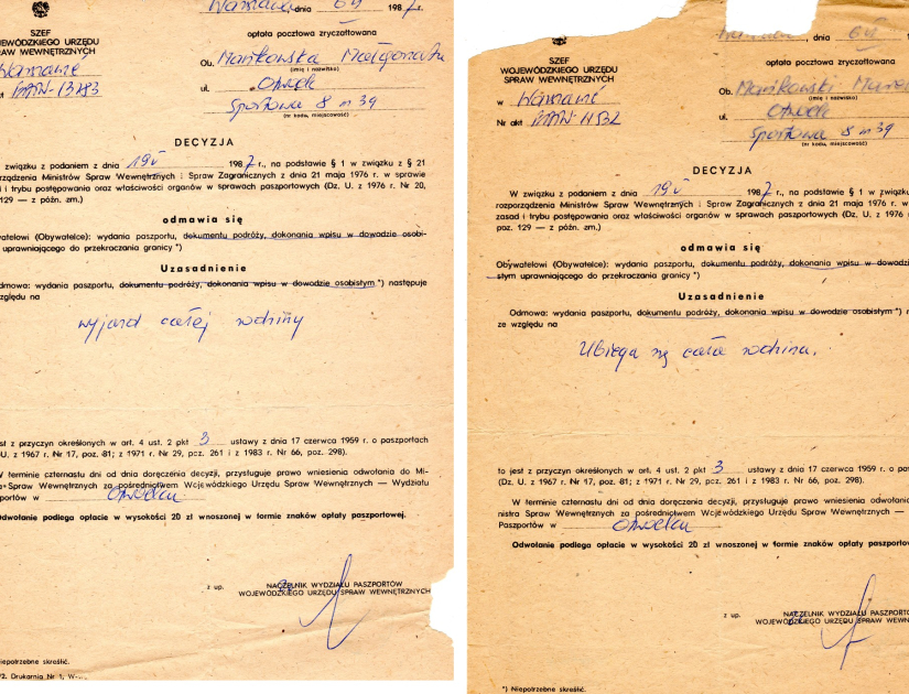 W moich aktach w MSW była na pewno notatka o próbie wyjazdu na emigrację w roku 1981 i potem 1982. Pisałem wcześniej jak podczas spotkania odwoławczego od negatywnej decyzji w ministerstwie w Warszawie, pani wice-minister powiedziała mi, że póki jestem w wieku produkcyjnym to z Polski nie wyjadę. To tę barierę miał pokonać mój kolega z klasy i to miało mnie kosztować 600 dolarów. Zbliżał się czas wyjazdu. Wreszcie wystąpiłem o paszporty załączając zaświadczenie z PTTK o wycieczce. 600 dolarów to była wtedy w Polsce bardzo poważna suma. Chciałem być „mądry” i zapłacić dopiero po otrzymaniu paszportów. Efekt był taki, że paszport dostał tylko nasz czternastoletni już syn Marcin, a do mnie i mojej żony przyszły urzędowe listy z odmową i uzasadnieniem, że o wyjazd stara się cała rodzina. Mam te listy do dzisiaj. Według władzy PRL-u czternastoletni chłopak miał jechać na wycieczkę do Wenecji sam. Tak, więc „skarcony”, wziąłem grzecznie 600 dolarów i zaniosłem tam gdzie miałem zanieść. Kilka tygodni później na komendę MO w Otwocku przyszły nasze paszporty. Odebrałem je z komendy o piątej po południu. Zaczęło się załatwianie wiz do Włoch i trazytowej przez Niemcy Zachodnie. Przed nami długa droga na Zachód.
