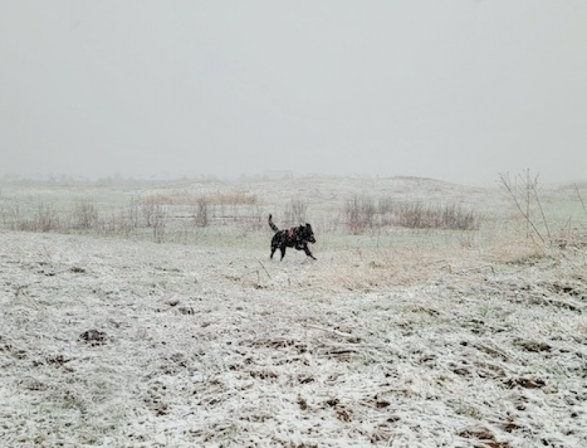 Mróz minął szybko i w południe było już plus osiem stopni i słonecznie, i wiosennie. Niestety tylko do czwartej po południu. Temperatura spadła gwałtownie i zaczął sypać gęsty śnieg. Tak gęsty, że zanim ubrałem psa w obrożę i uprząż już z szyby musiałem odgarniać sporą jego warstwę.