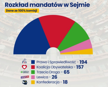 Prawo i Sprawiedliwość zostało zwycięzcą wyborów parlamentarnych i do Sejmu wprowadzi 194 reprezentantów. Koalicja Obywatelska uzyskała 157 mandatów, Trzecia Droga