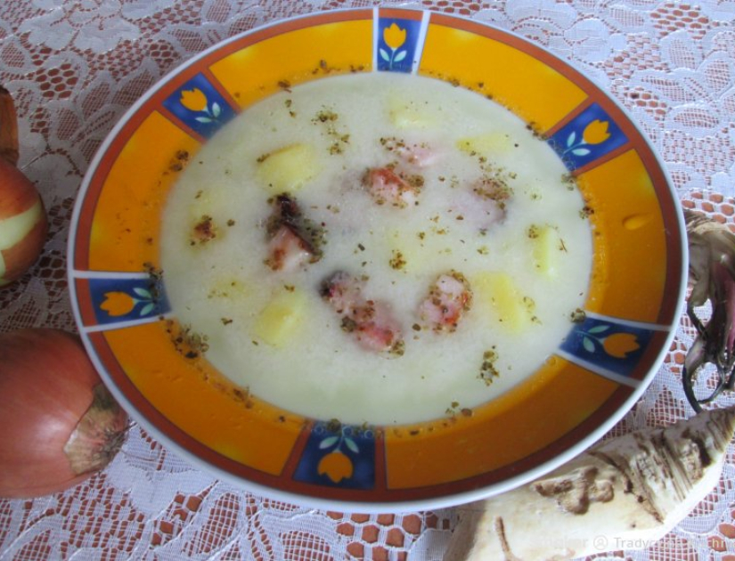 Cebulę obieramy, drobno kroimy i przesmażamy na maśle, a kiedy się zeszkli, oprószamy mąką i rumienimy. W tym czasie przygotowujemy bulion, którym – po wystygnięciu – zalewamy cebulę i przez kwadrans gotujemy. Następnie całość przecieramy przez sito i doprawiamy solą, pieprzem, gałką muszkatołową, a także szczyptą słodkiej papryki, curry oraz imbiru. Z chlebków odcinamy górną część i wydrążamy środek, bo to one będą „talerzami”. Bułki kroimy w kostkę. Zupę przelewamy do naczynia żaroodpornego, dodajemy do niej starty żółty ser i wstawiamy – razem z chlebkami – na 10 minut do mocno nagrzanego piekarnika. Gorącą zupę przelewamy do chlebków, a na wierzch wrzucamy po kilka grzanek oraz posiekaną natkę pietruszki.
