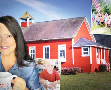 Idealny mały czerwony budynek szkoły stoi na działce pod Petersburgiem w Wirginii, ma cztery ściany, maszt flagowy i ma klasyczny